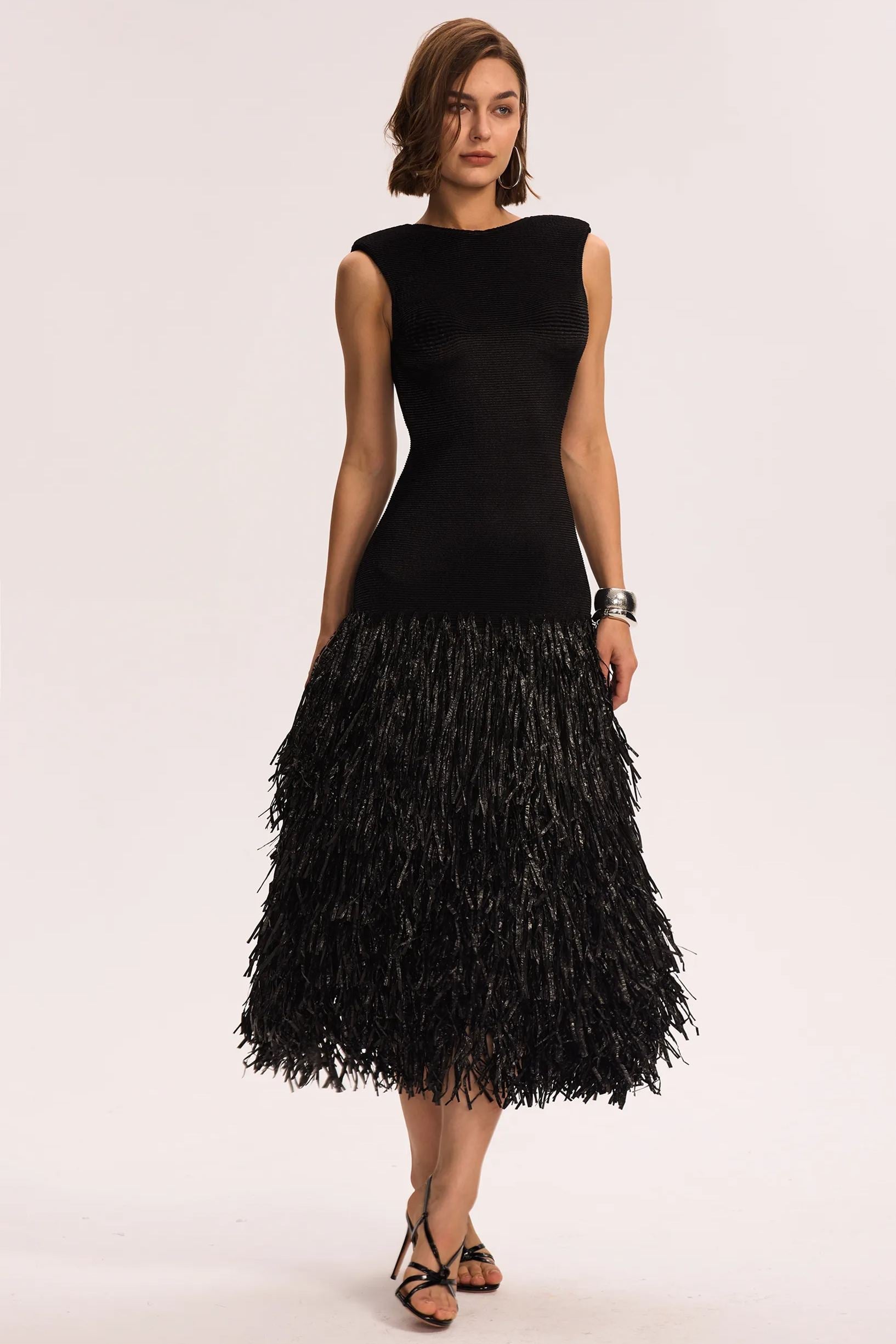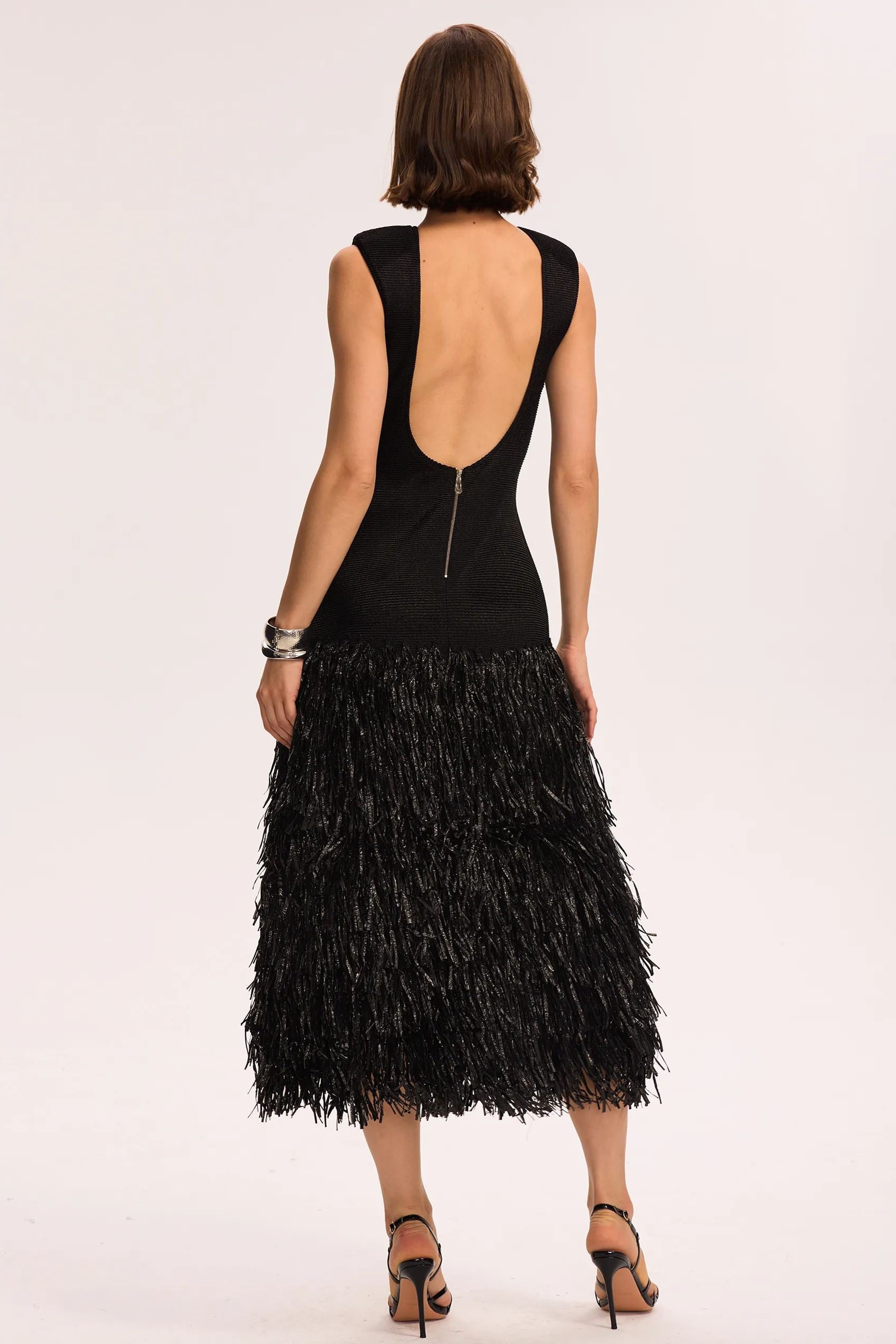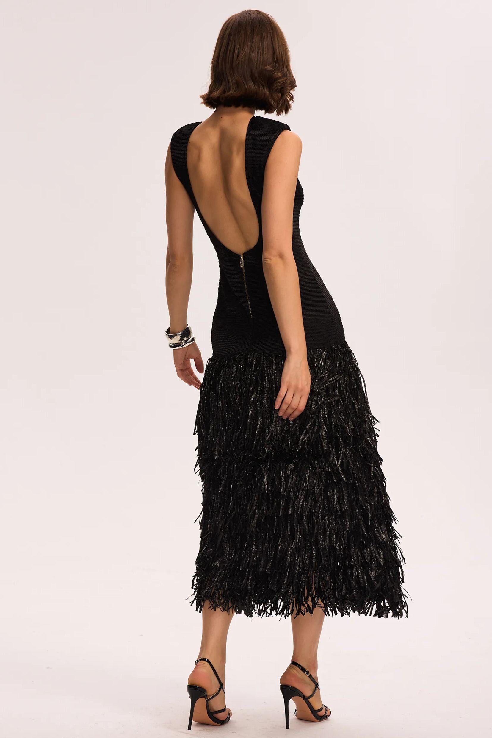 Mavis Sırtı Açık Püsküllü Triko Midi Elbise