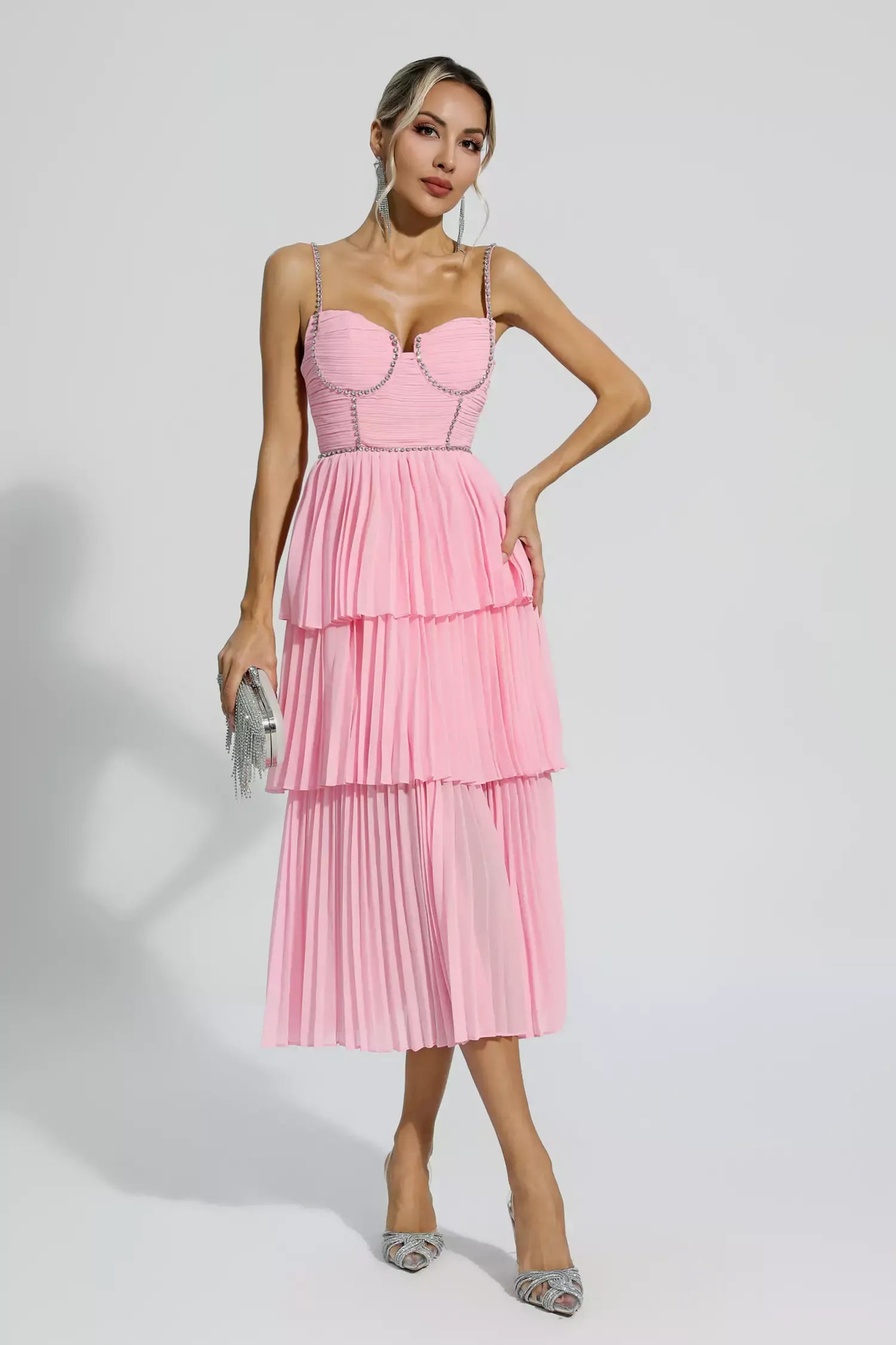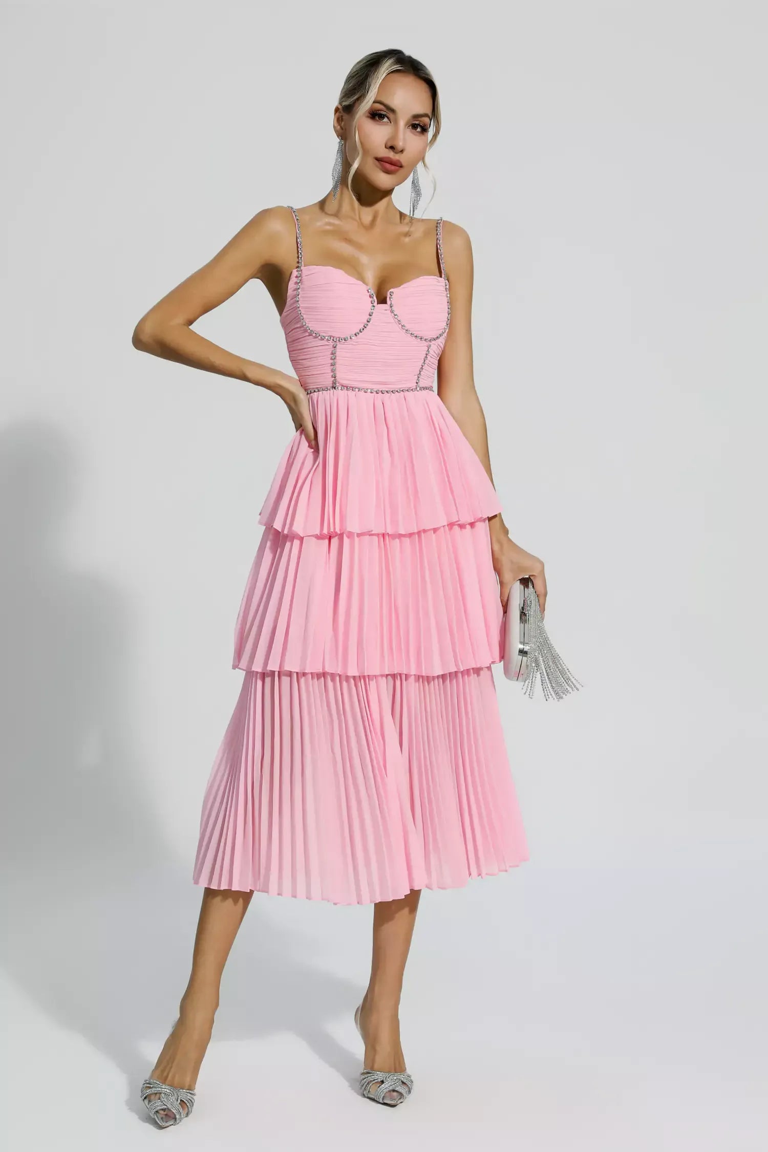 Meredith Pembe Pırlanta Dantelli Midi Elbise
