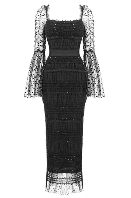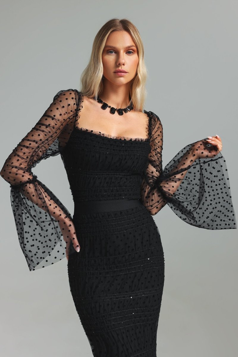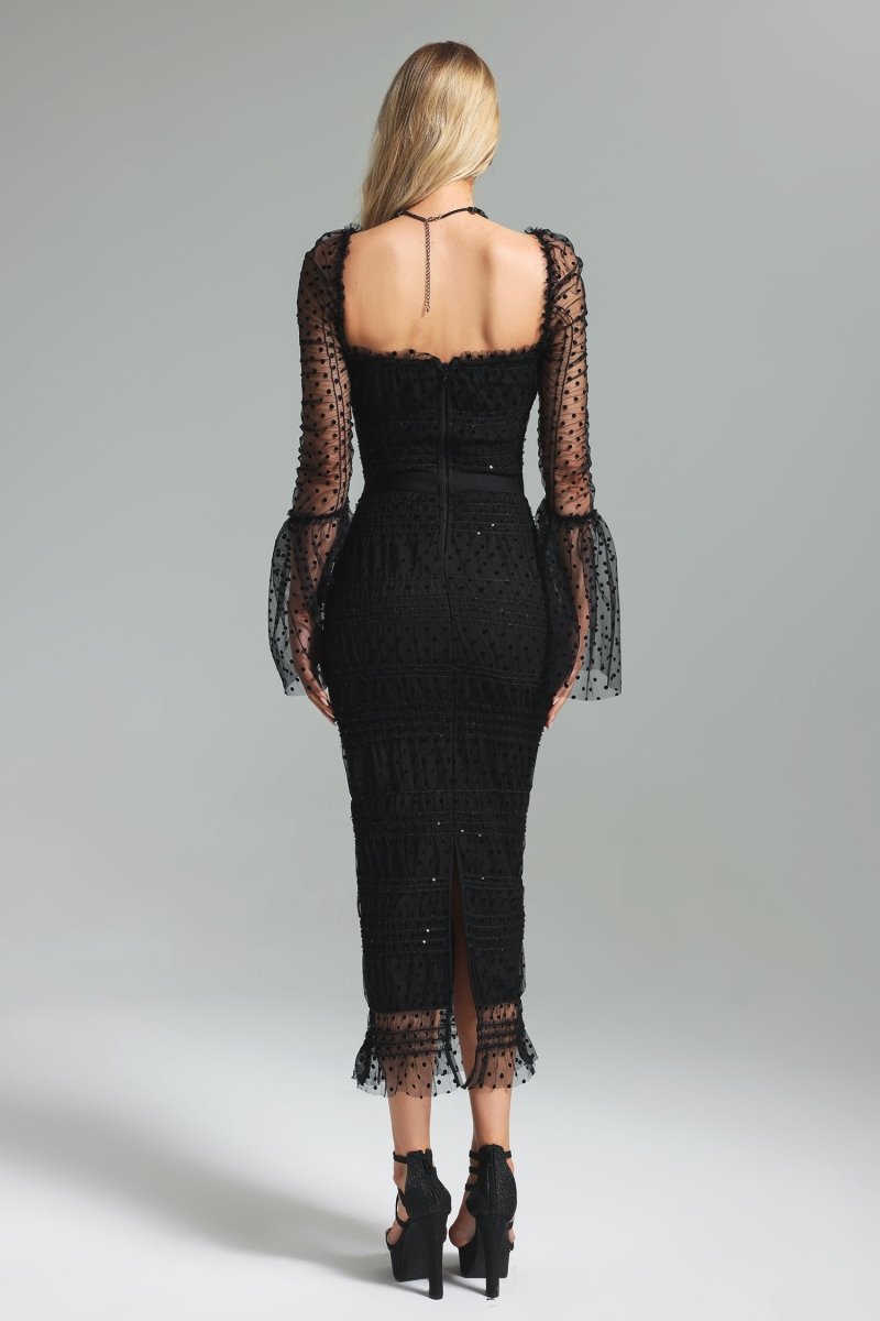Monica Payet İşlemeli Kare Yaka File Midi Elbise