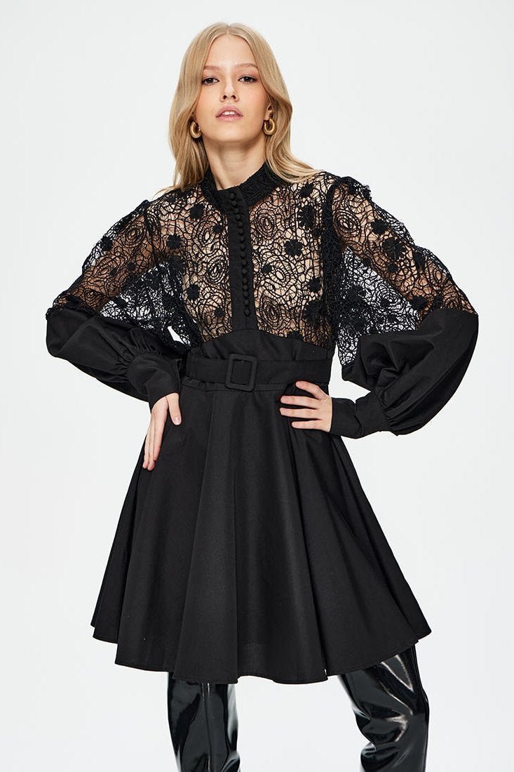 Myra İçi Boş İşlemeli Dantel Kuşaklı Mini Gömlek Elbise