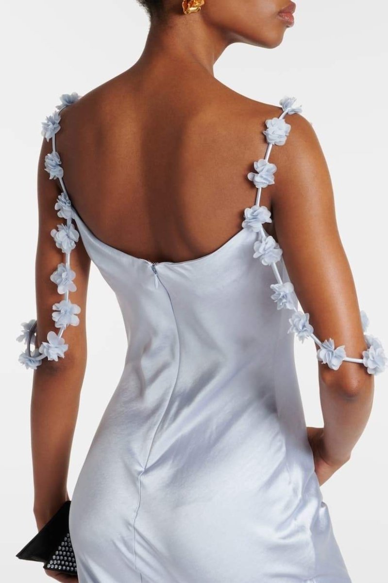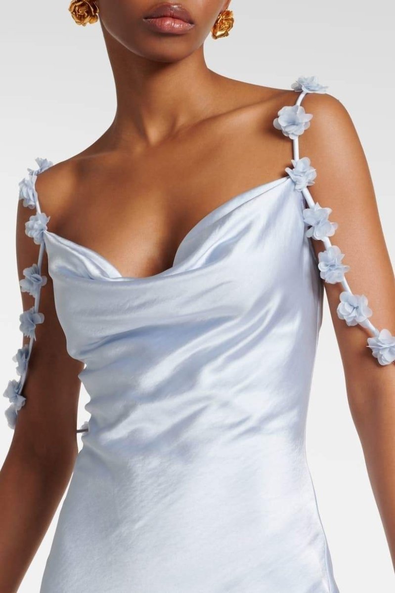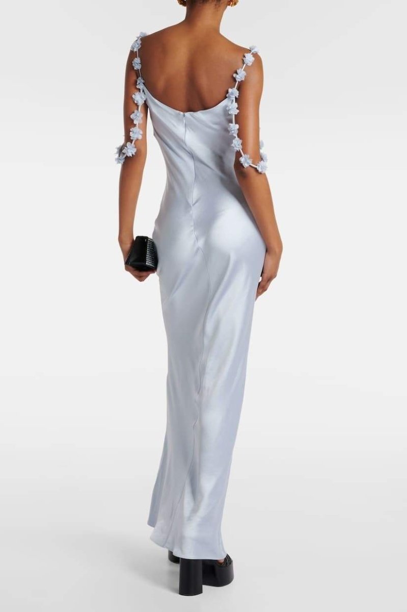 Zeytinyağı Çiçek Aplikeli Saten Maxi Elbise