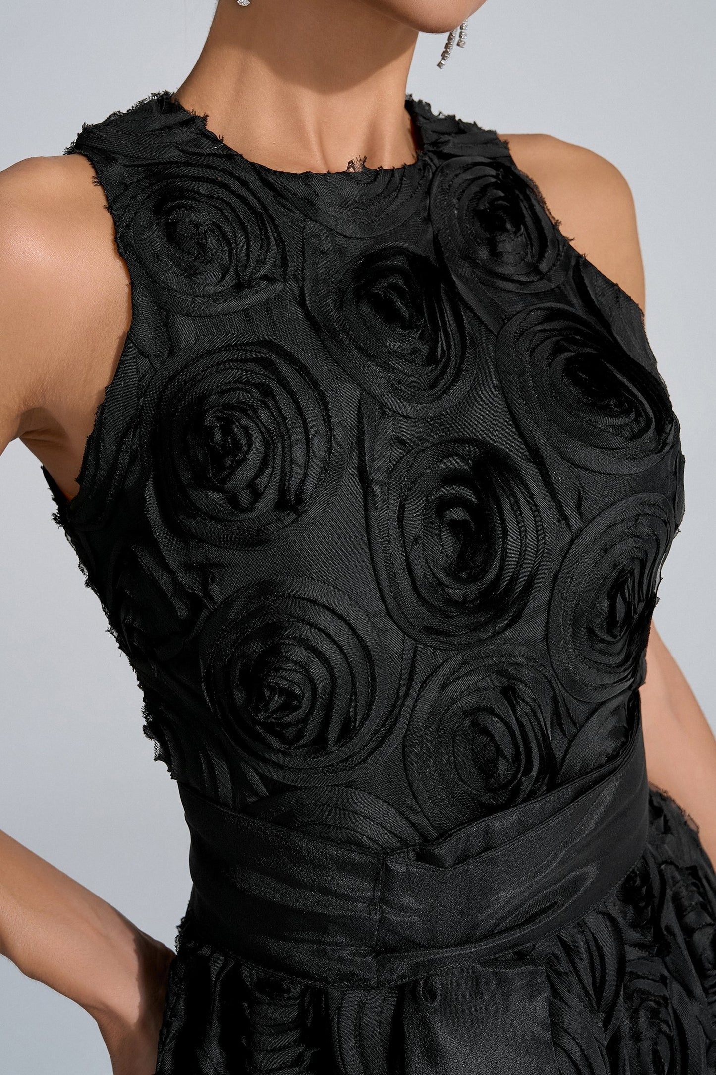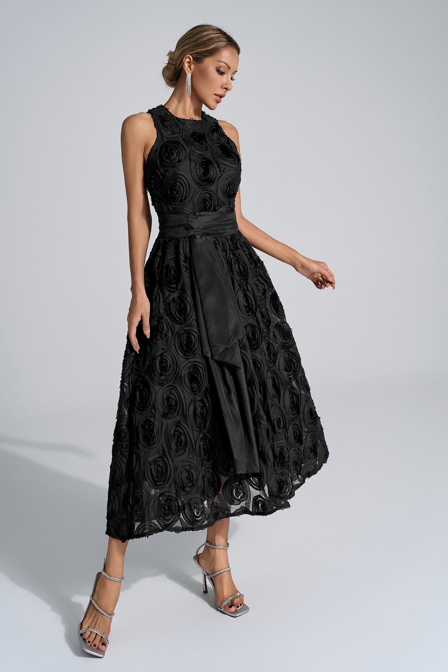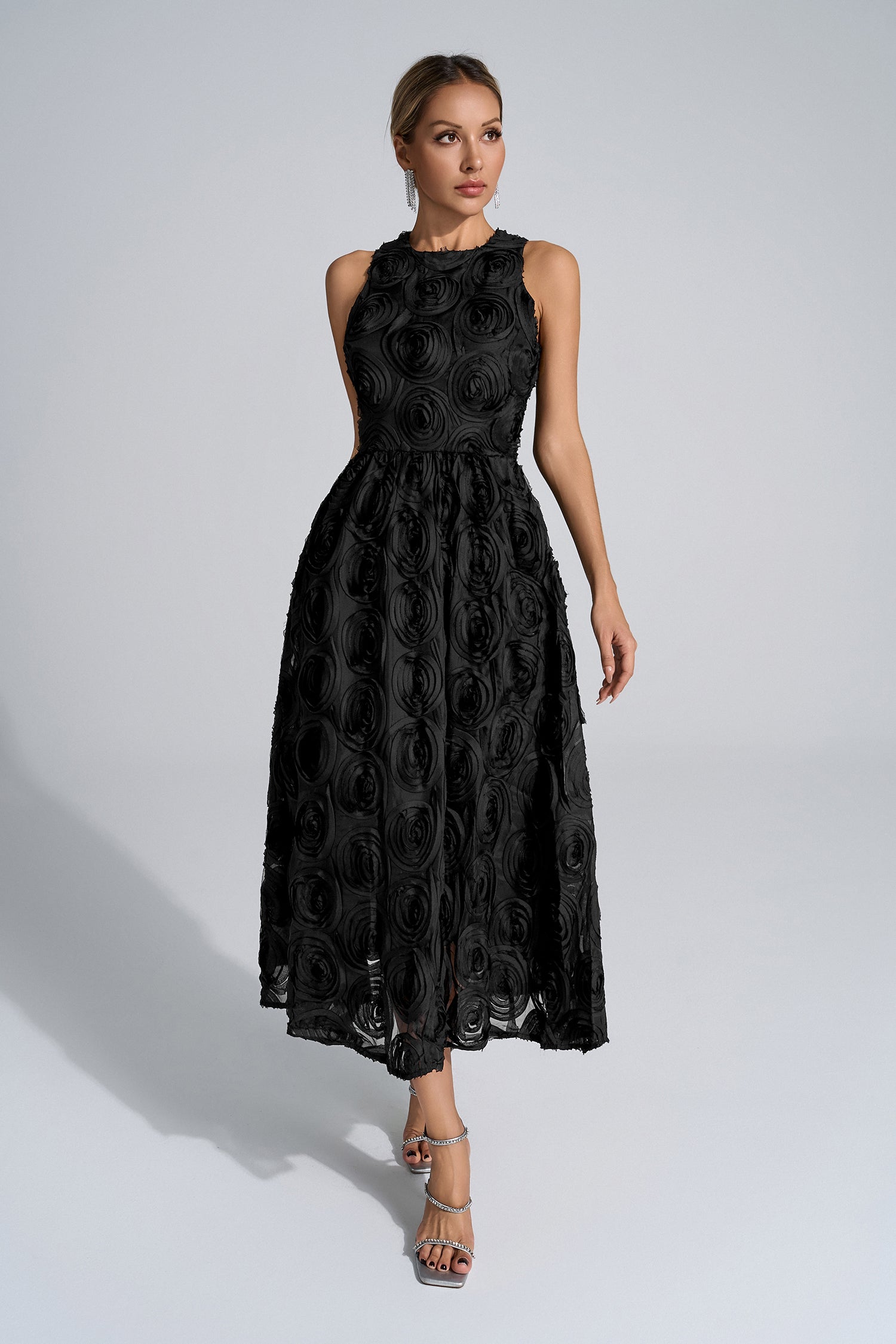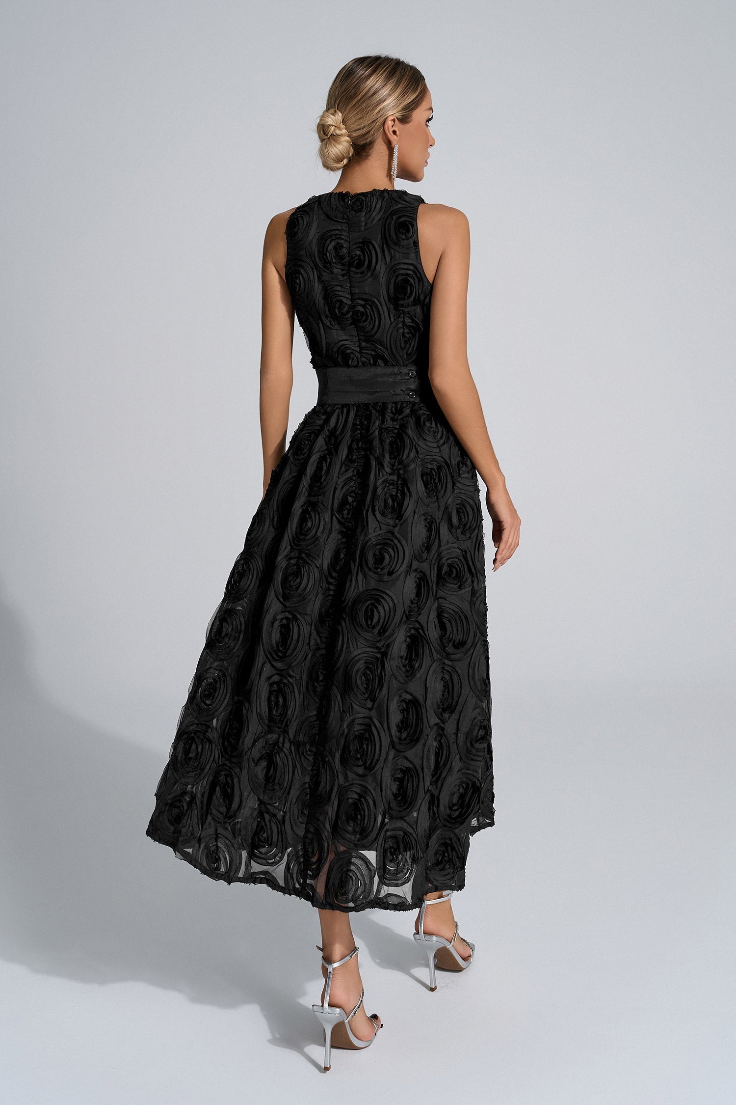 Biberiye Siyah 3D Çiçekli Uzun Elbise