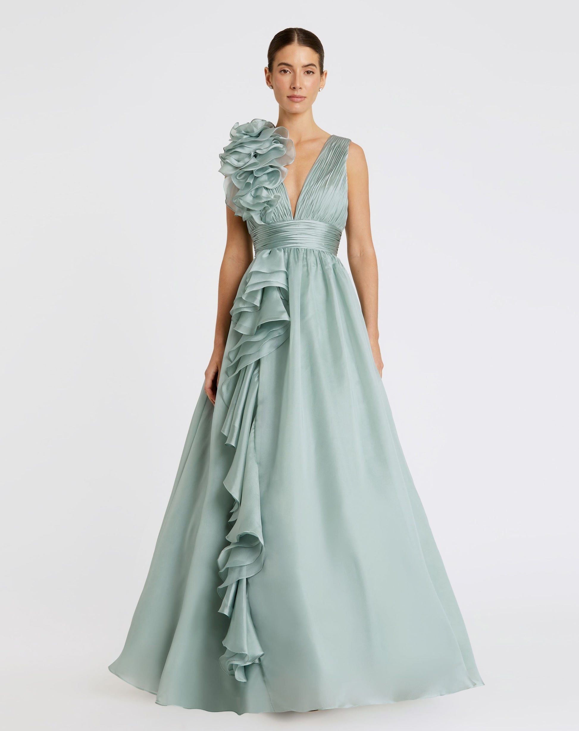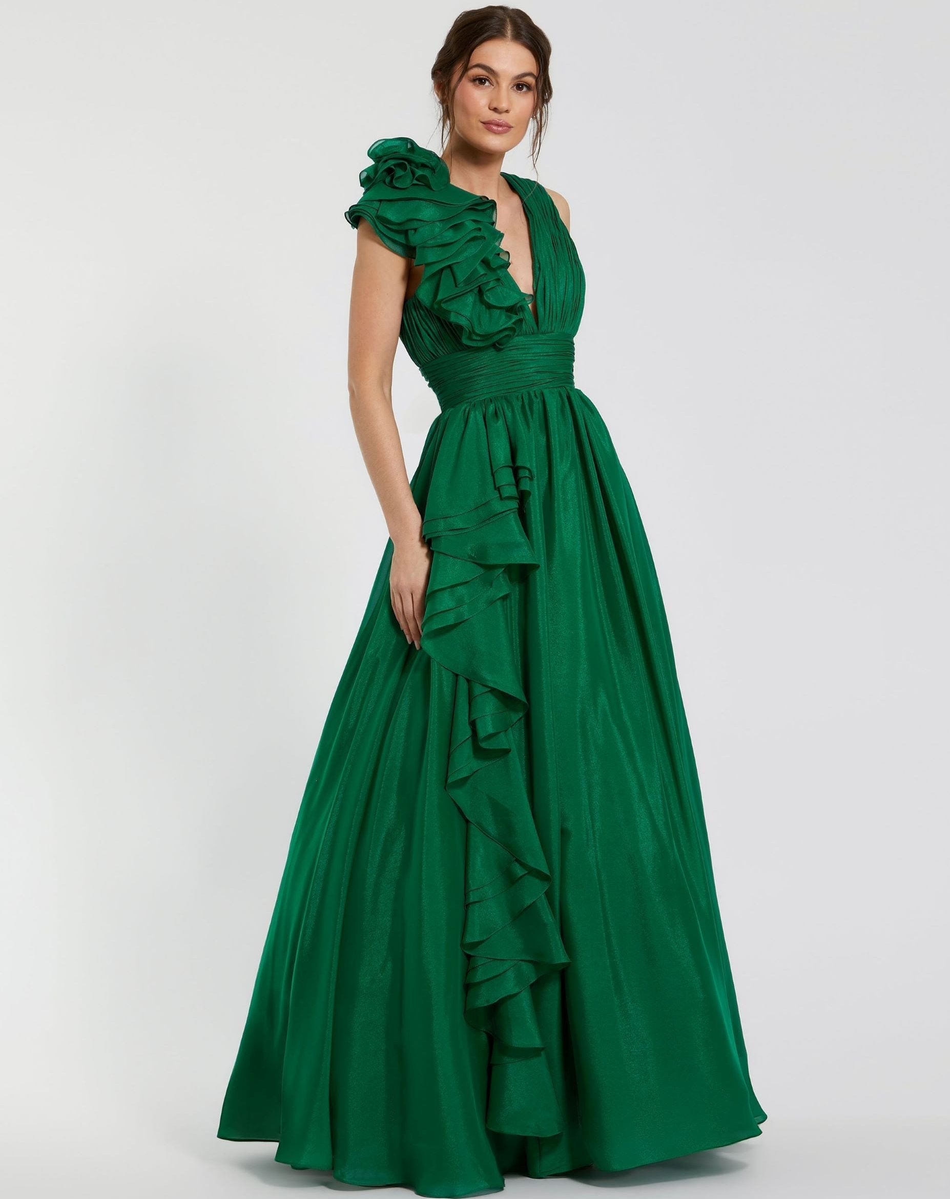 Alevna™ Fırfırlı Omuz V Yaka Şifon Abiye