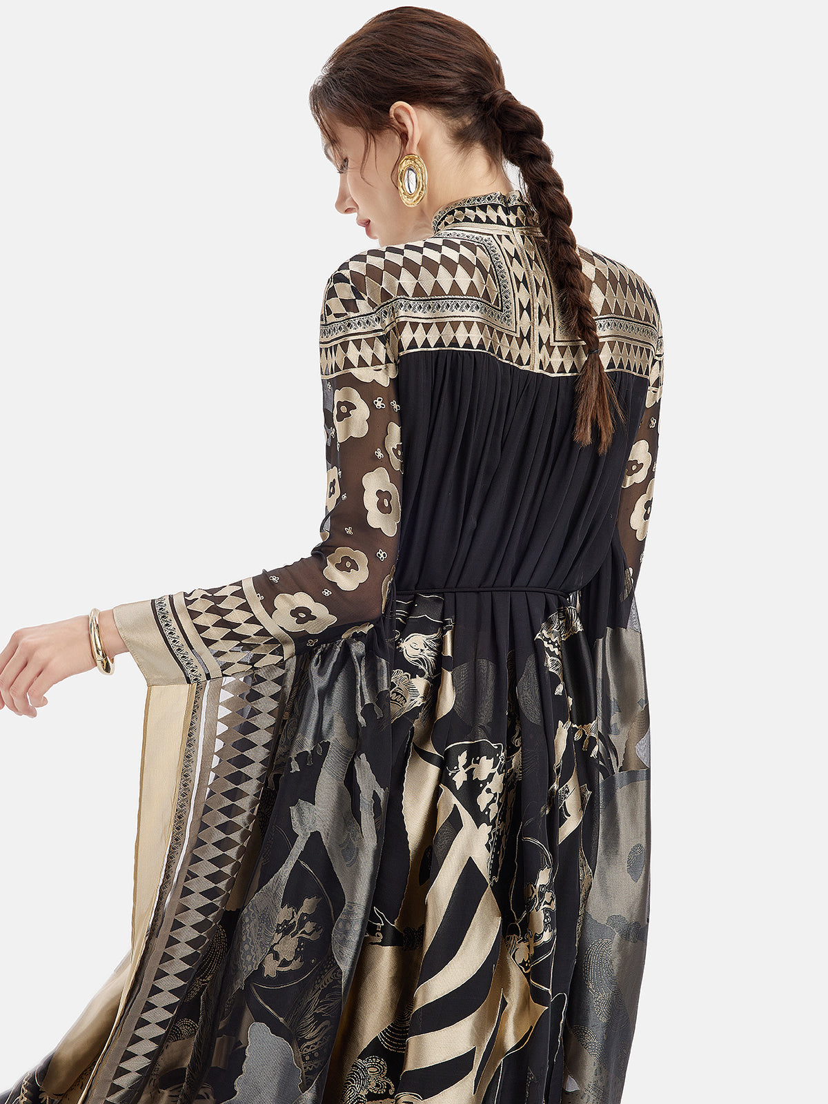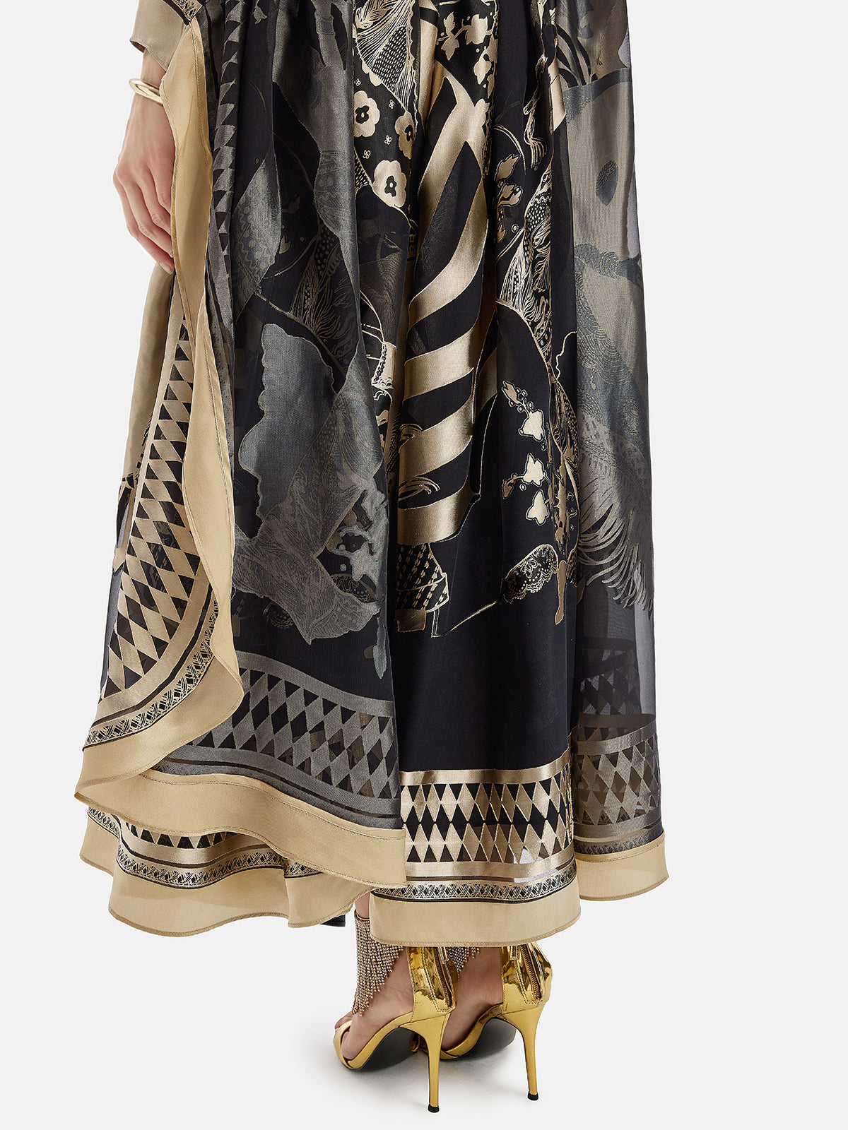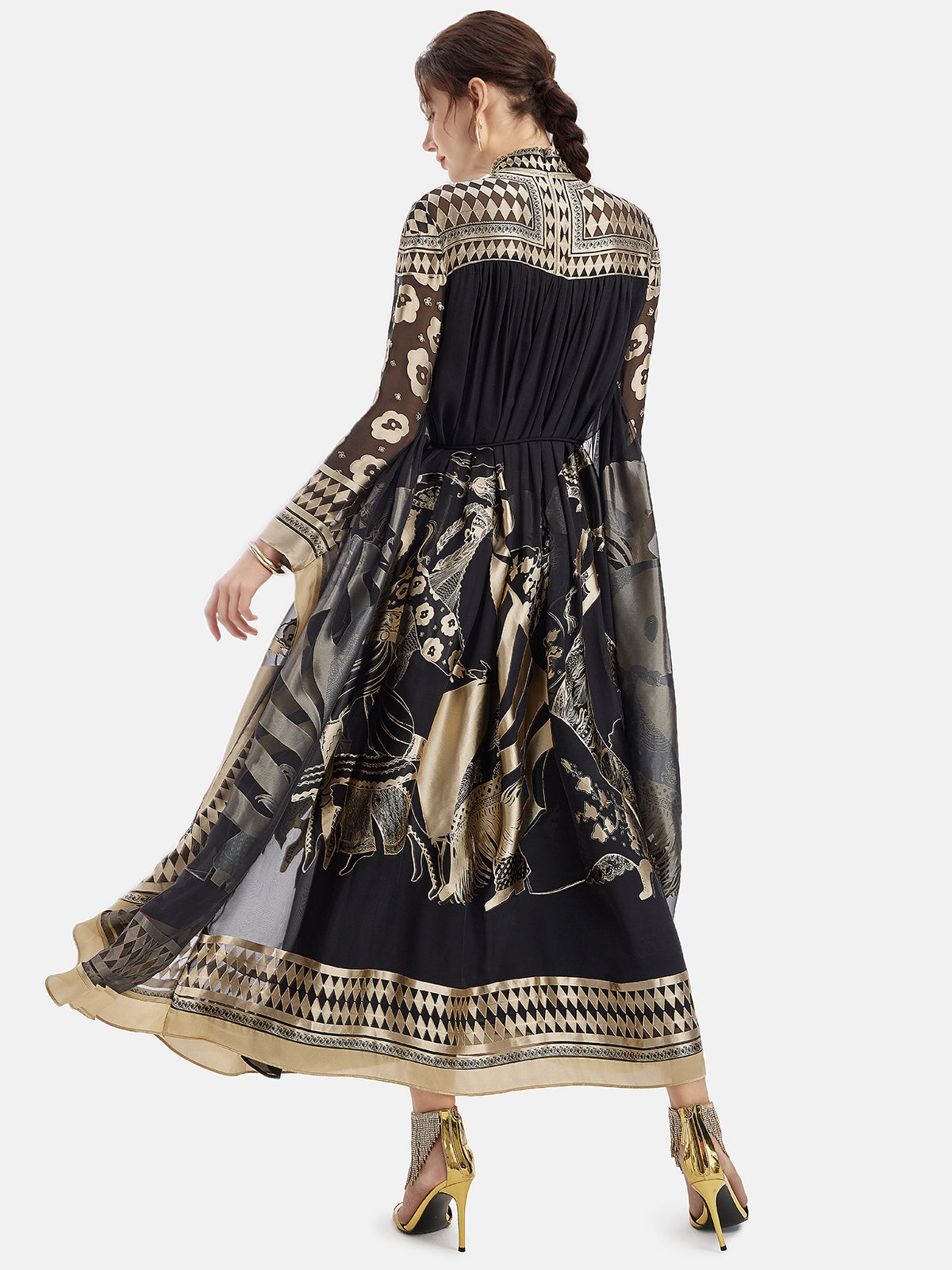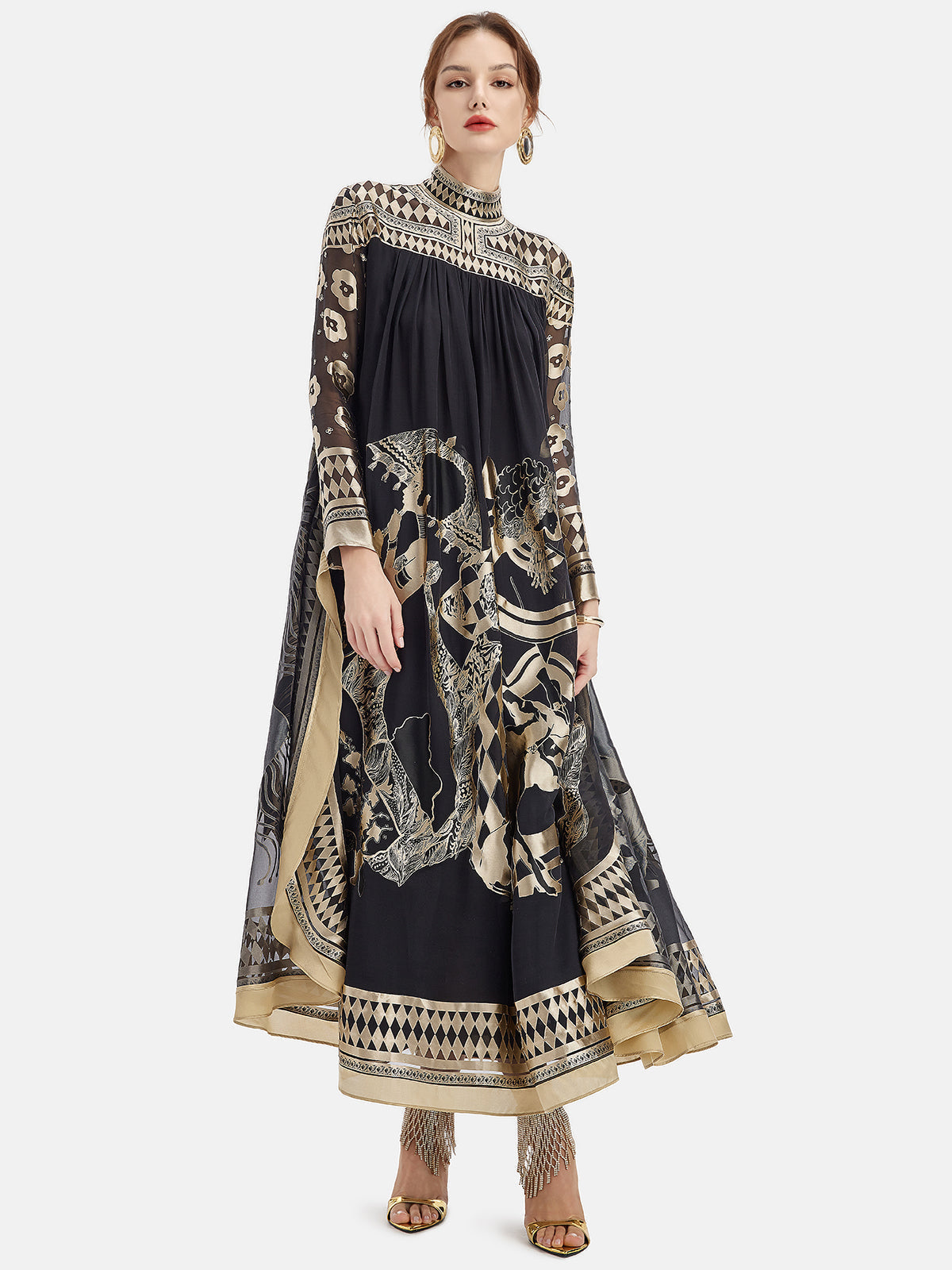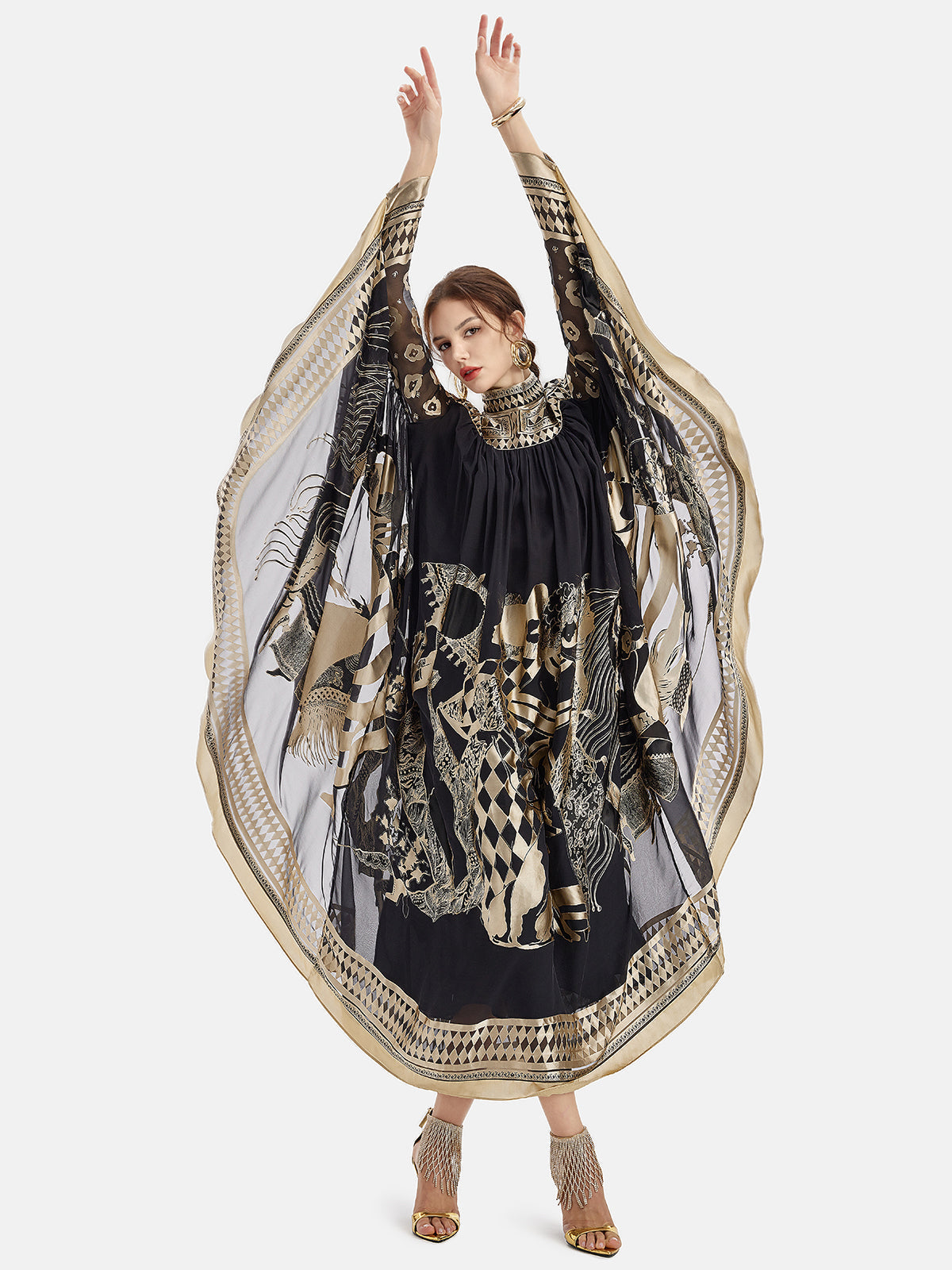 Vintage Siyah Ve Altın Baskılı Batwing Pelerin Elbise