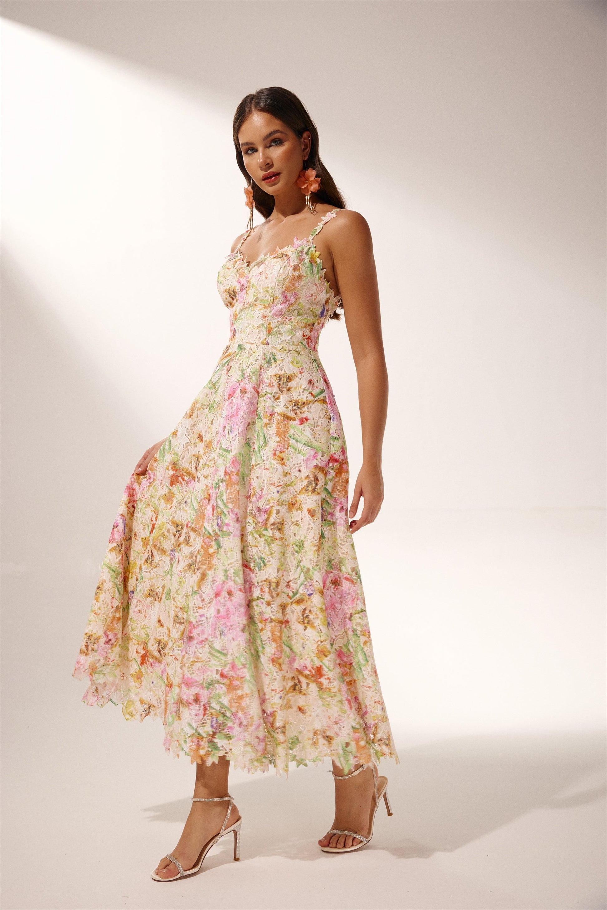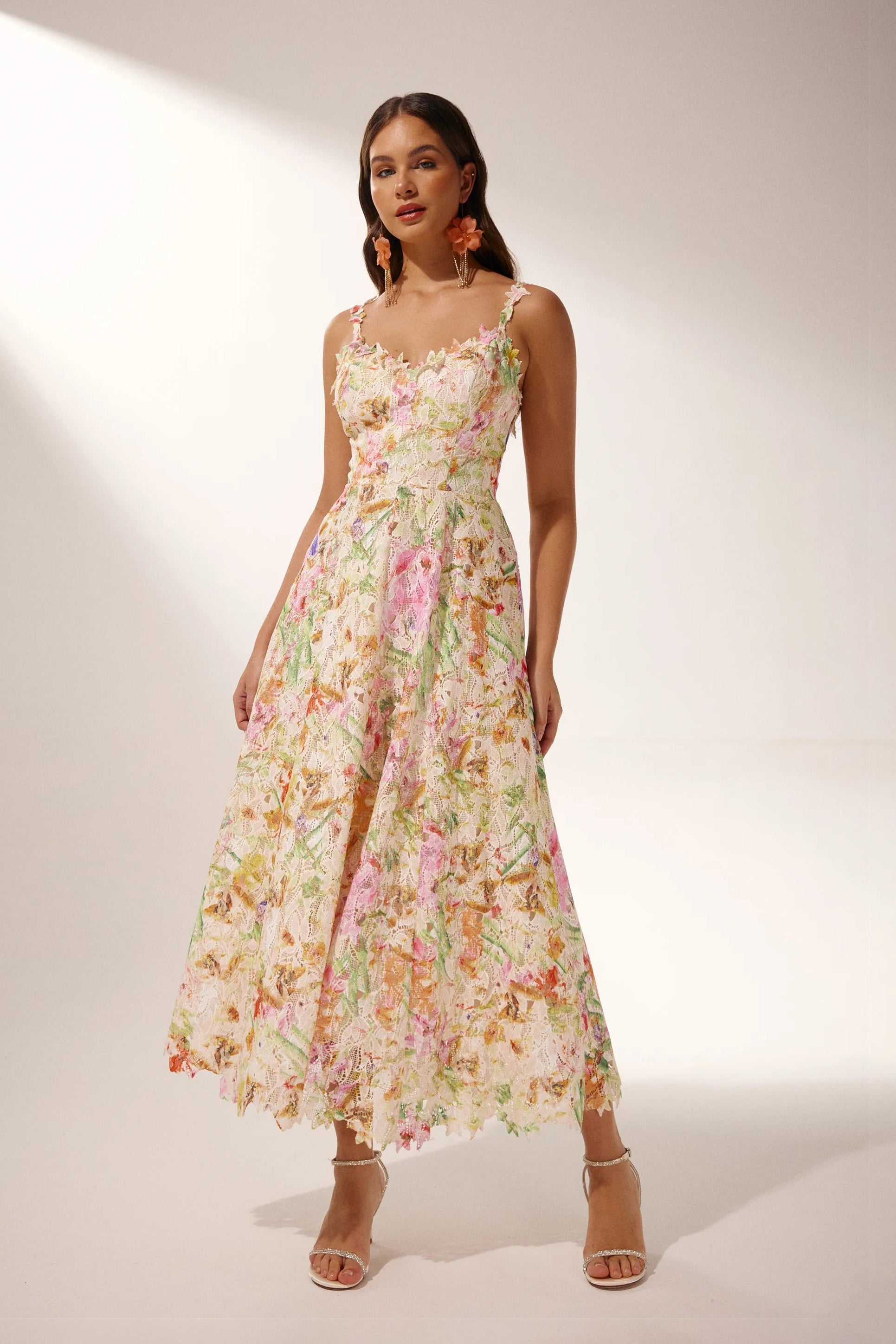 Mor Çiçek İşlemeli Dantel Midi Elbise