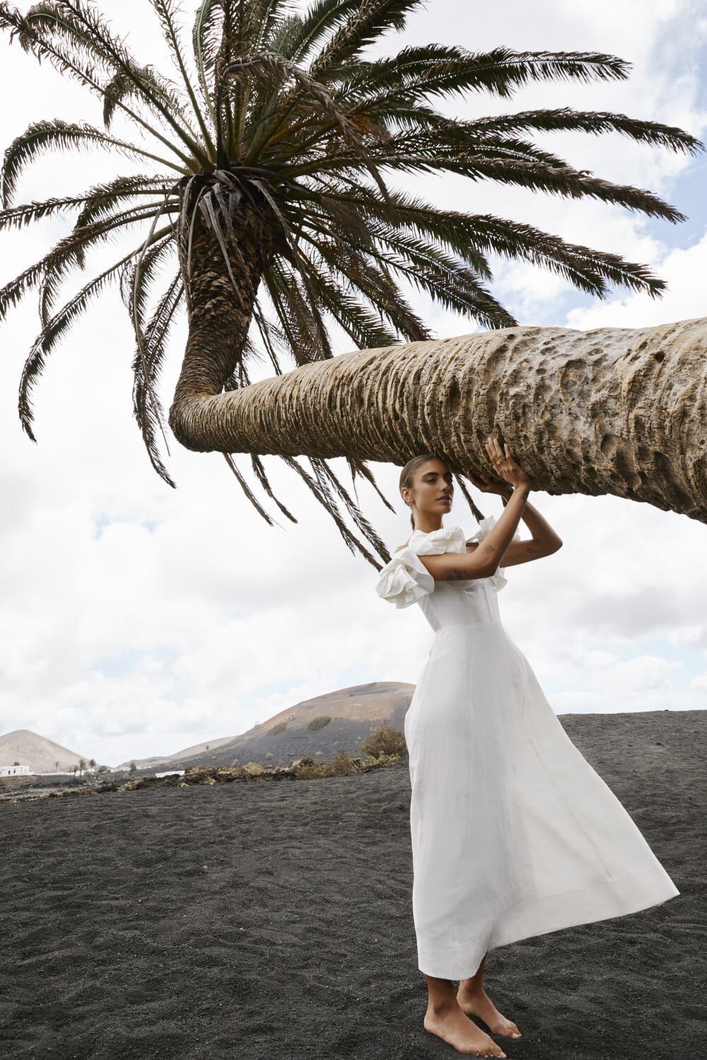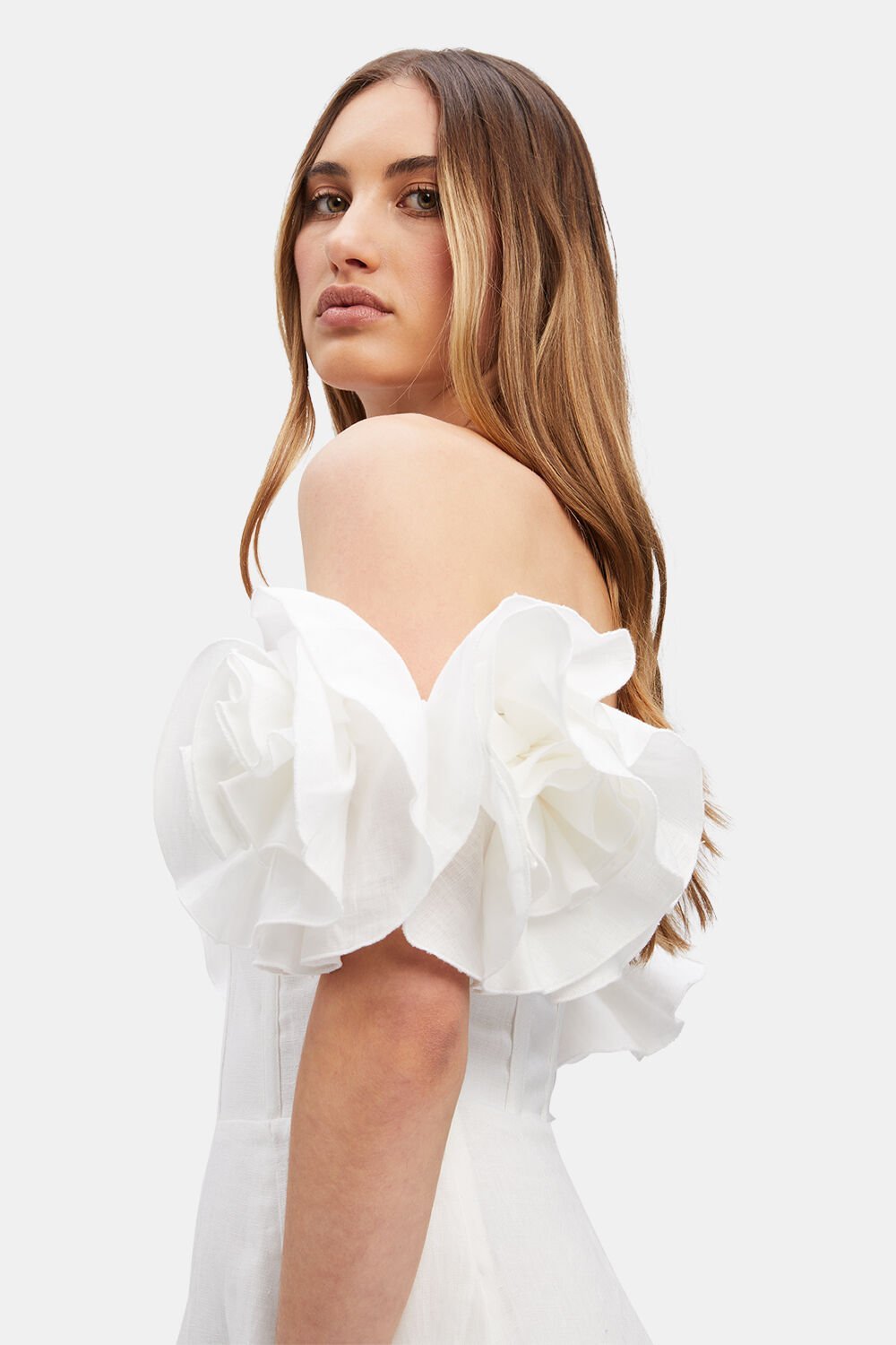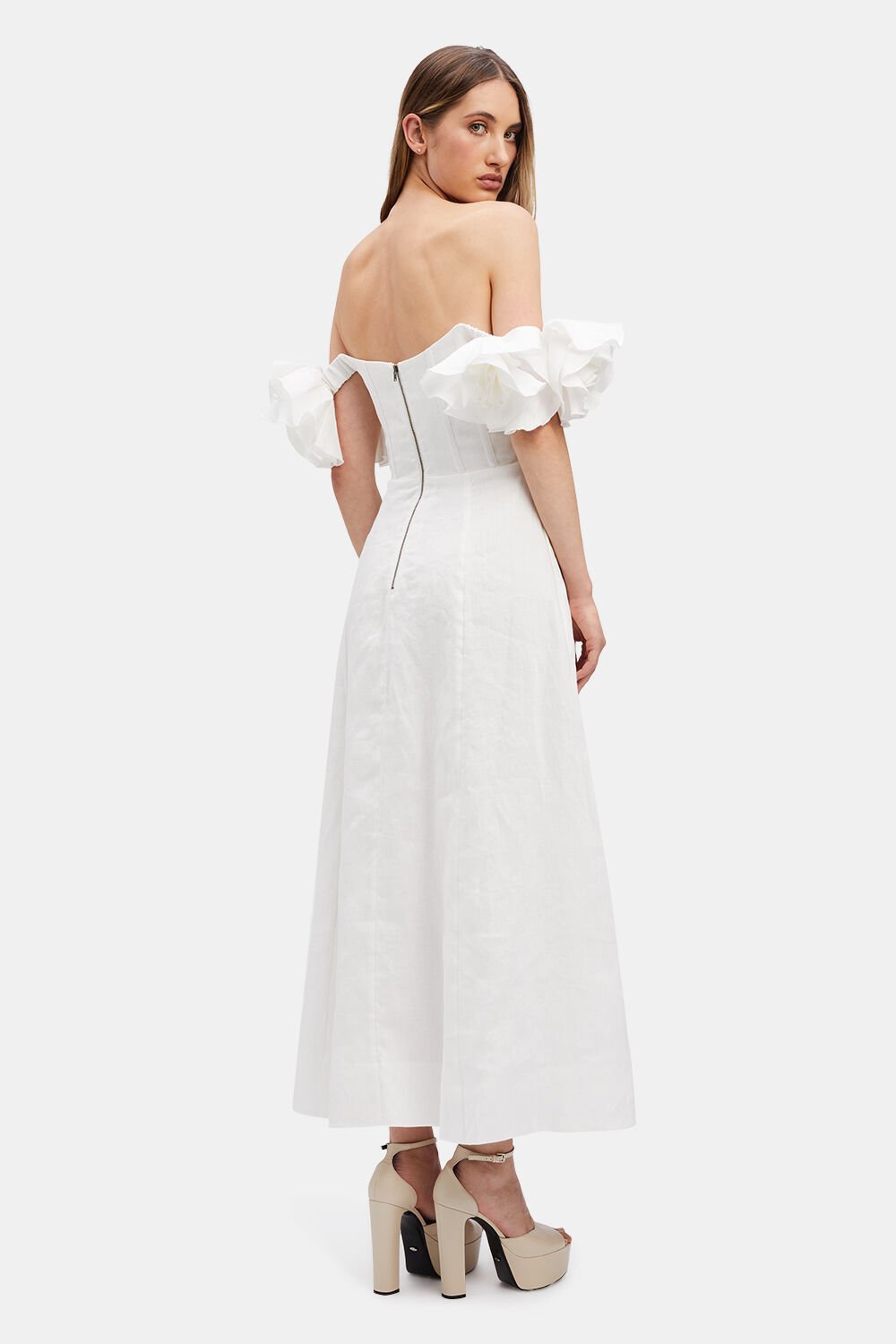Zolia Çiçek Omuzu Açık Keten Midi Elbise